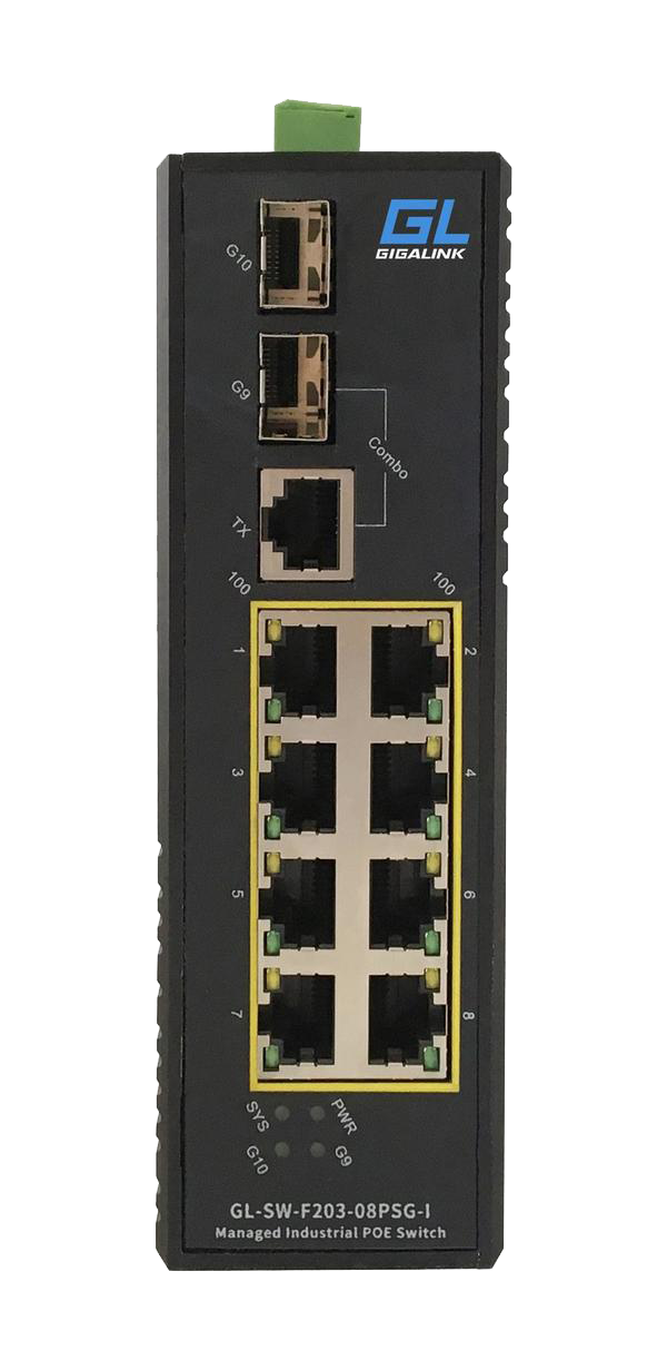 Коммутатор GIGALINK, управляемый L2, индустриальный на DIN рейку, 8 PoE (802.3af/at) портов, 1 combo RJ45/SFP 1G, 1SFP 1G